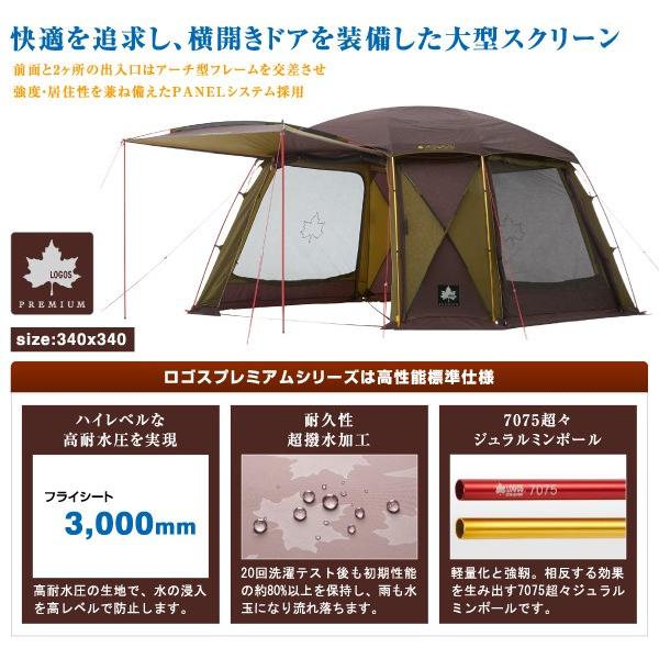 横開きドア パネルシステム uvカット 断熱 撥水 集会 イベント キャンプ アウトドア ランタンフック付き 大型ベンチレーション 難燃性生地 キャノピーポール付き テントと連結可 タープ。タープ ロゴス logos 『 プレミアム panelスクリーン 340ae 』 スクリーン タープテント スクリーンタープ